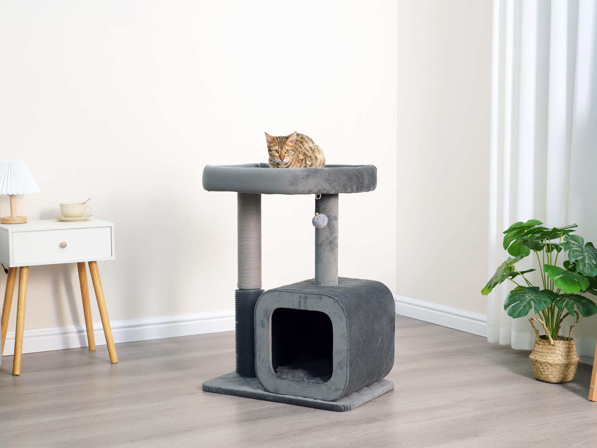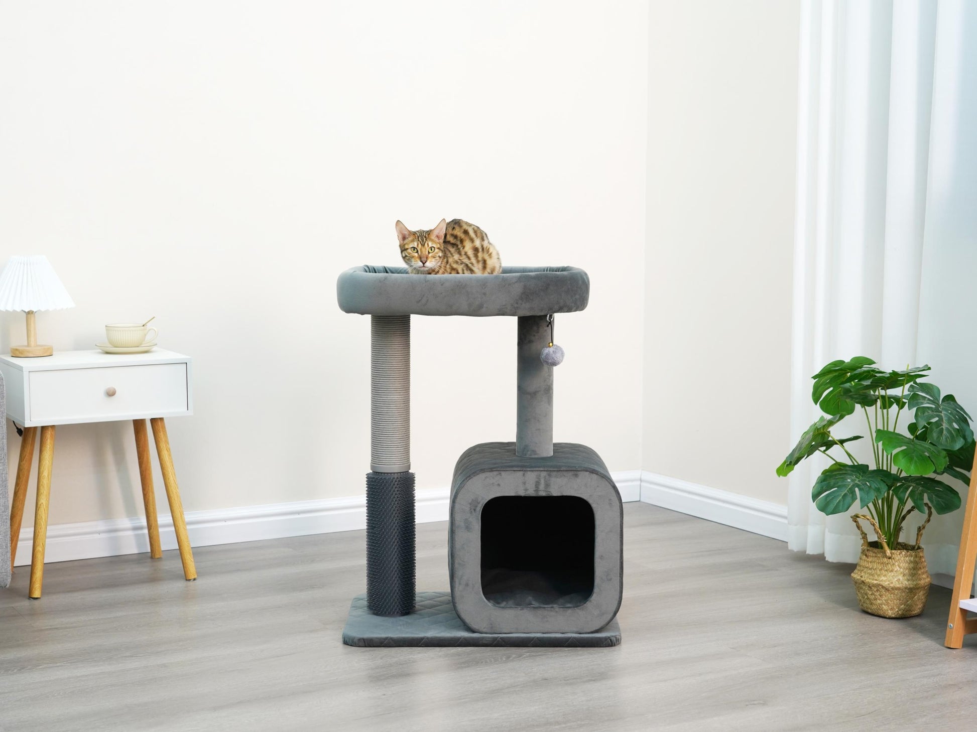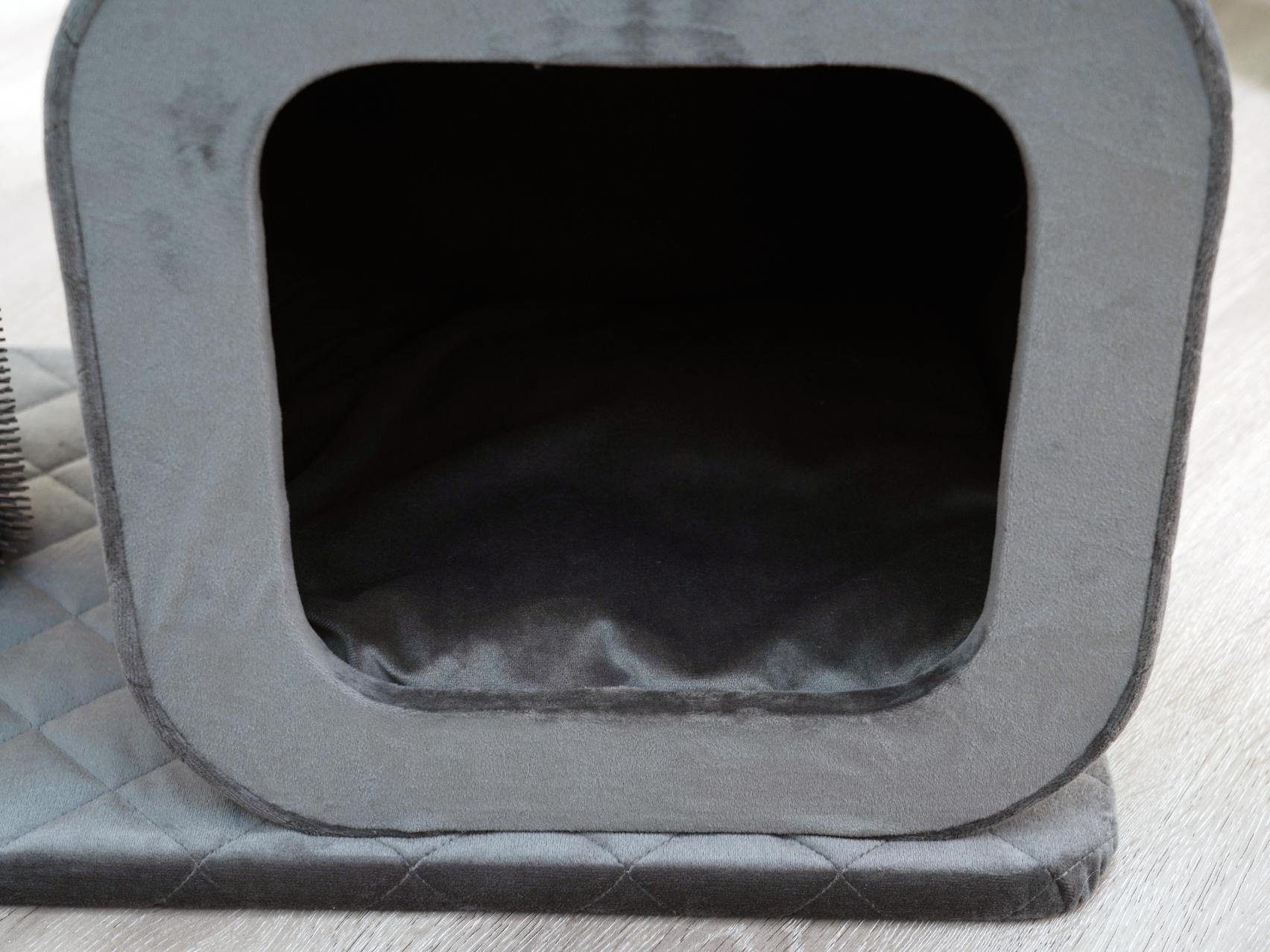 Catry Eclipse is a modern apartment-sized 2-level cat tower with a condo and rubber groomer. This cat tree is the perfect blend of comfort and style, making it ideal for compact living spaces such as apartments. Eclipse features a recycled paper scratching post, an engaging teaser toy, and a playful rubber groomer! The Eclipse's compact, minimalistic design seamlessly integrates into modern home decor. Its contemporary aesthetic, highlighted by a monochromatic color scheme, adds a touch of sophistication to your living space while providing your cat with the ultimate comfort and entertainment.