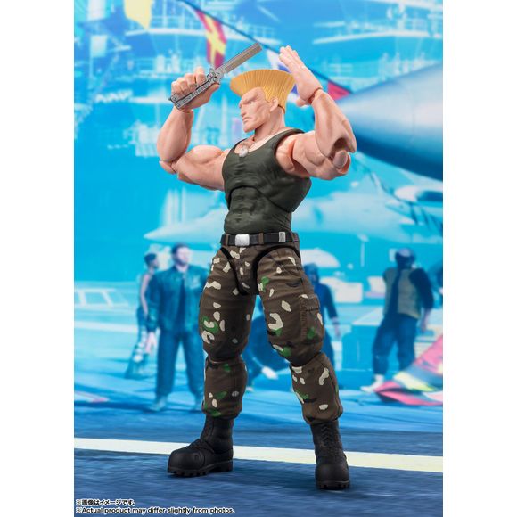 Guile from the "Street Fighter" game series finally joins the "S.H.Figuarts" action-figure lineup from Bandai! He wears his classic costume, seen in the early part of the series, as well as the latest game, "Street Fighter 6"! His wide range of motion allows you to reproduce his special moves, and he comes with a Sonic Boom effect part, too. A background sheet with a stage from the game is included, as are two interchangeable faces.