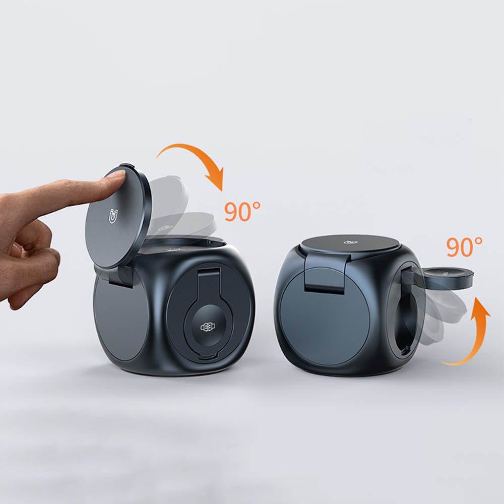 FluxSphere 3-in-1 MagSafe 충전 스탠드는 iPhone, Apple Watch, AirPods를 위한 완벽한 충전 경험을 제공하도록 설계되었습니다. 컴팩트하고 접이식이며 미래지향적인 독특한 구형 디자인 으로 눈길을 사로잡을 뿐만 아니라 보관과 휴대가 간편하여 가정, 사무실 또는 여행에 적합합니다. 자석 흡착 기술을 사용하여 기기를 안전하게 고정하여 빠르고 안정적인 충전을 제공하며, 어떤 환경에도 어울리는 모던한 디자인을 자랑합니다. 또한, 휴대폰을 세로 또는 가로 방향 으로 자유롭게 전환할 수 있어 매끄러운 사용 경험을 보장합니다. 세련되고 조각 같은 디자인과 다기능 충전 기능이 결합된 FluxSphere 3-in-1 MagSafe 충전 스탠드는 깔끔하고 세련된 작업 공간을 유지하는 최고의 도구입니다. MagSafe 케이스와 호환되어 모든 기기에 전원을 공급하는 효율적이고 간편한 솔루션을 제공하는 동시에 최첨단 기술 액세서리처럼 보입니다.