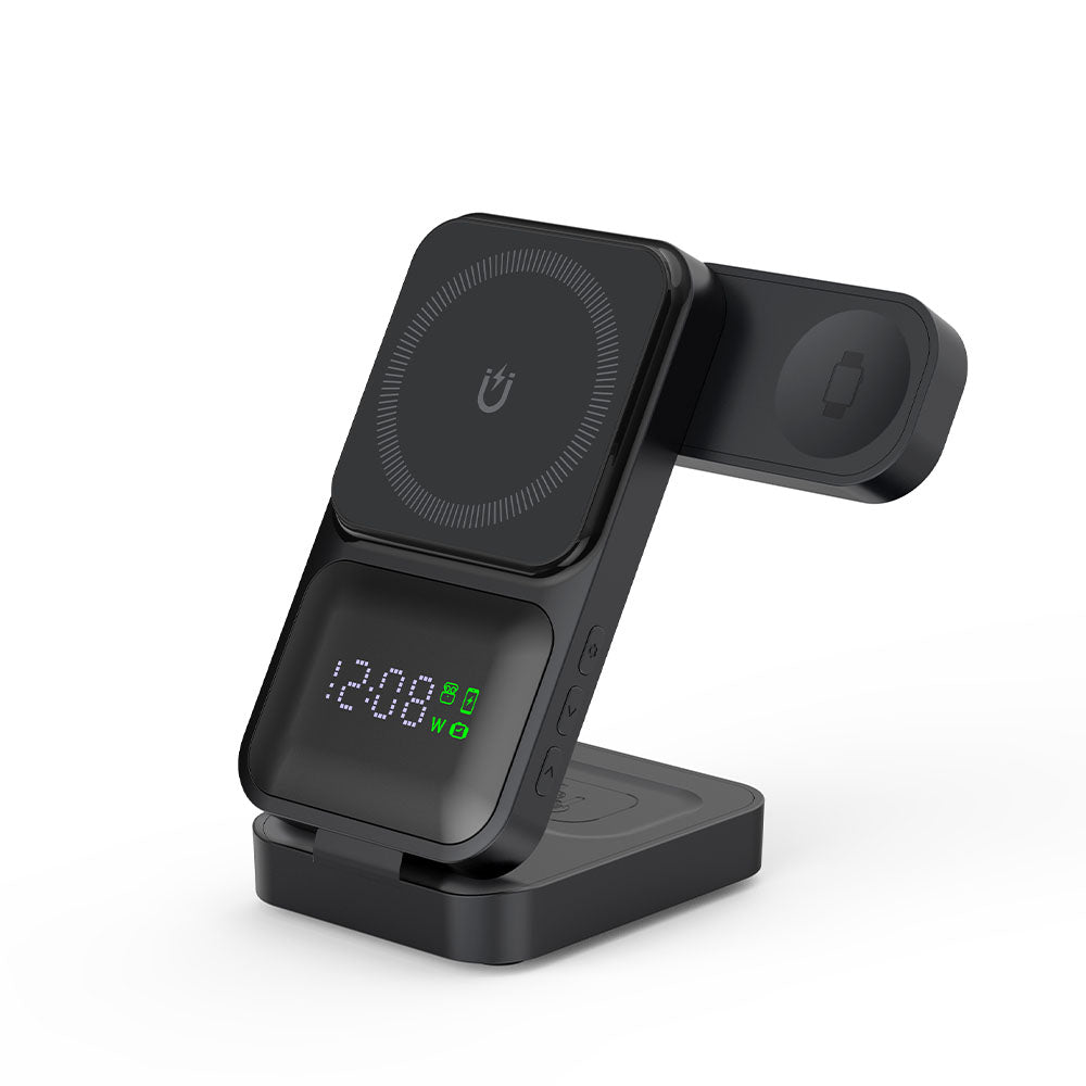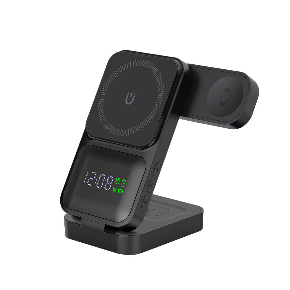 MagNova 3-in-1 무선 충전기는 편리함, 기능성, 스타일을 모두 갖춰 더욱 편리한 생활을 선사합니다. iPhone, Apple Watch, AirPods를 한 번에 충전할 수 있어 여러 대의 충전기를 사용할 필요가 없고, 공간을 깔끔하고 정돈된 상태로 유지할 수 있습니다. 접이식 및 조절 가능한 디자인 으로 휴대성이 뛰어나 여행이나 가정에서 사용하기에 적합합니다. 가로 모드와 세로 모드를 간편하게 전환할 수 있어 비디오 시청, 업무, 또는 기기를 가까이 두기에 이상적입니다. 또한, 내장된 시간 표시 기능으로 시간을 한눈에 확인할 수 있어 충전 편의성을 더욱 높여줍니다. 세련된 디자인과 실용적인 기능을 갖춘 MagNova 3-in-1 무선 충전기는 일상을 더욱 간편하게 만들어 주고 어디에서나 기기를 충전할 수 있도록 도와줍니다.