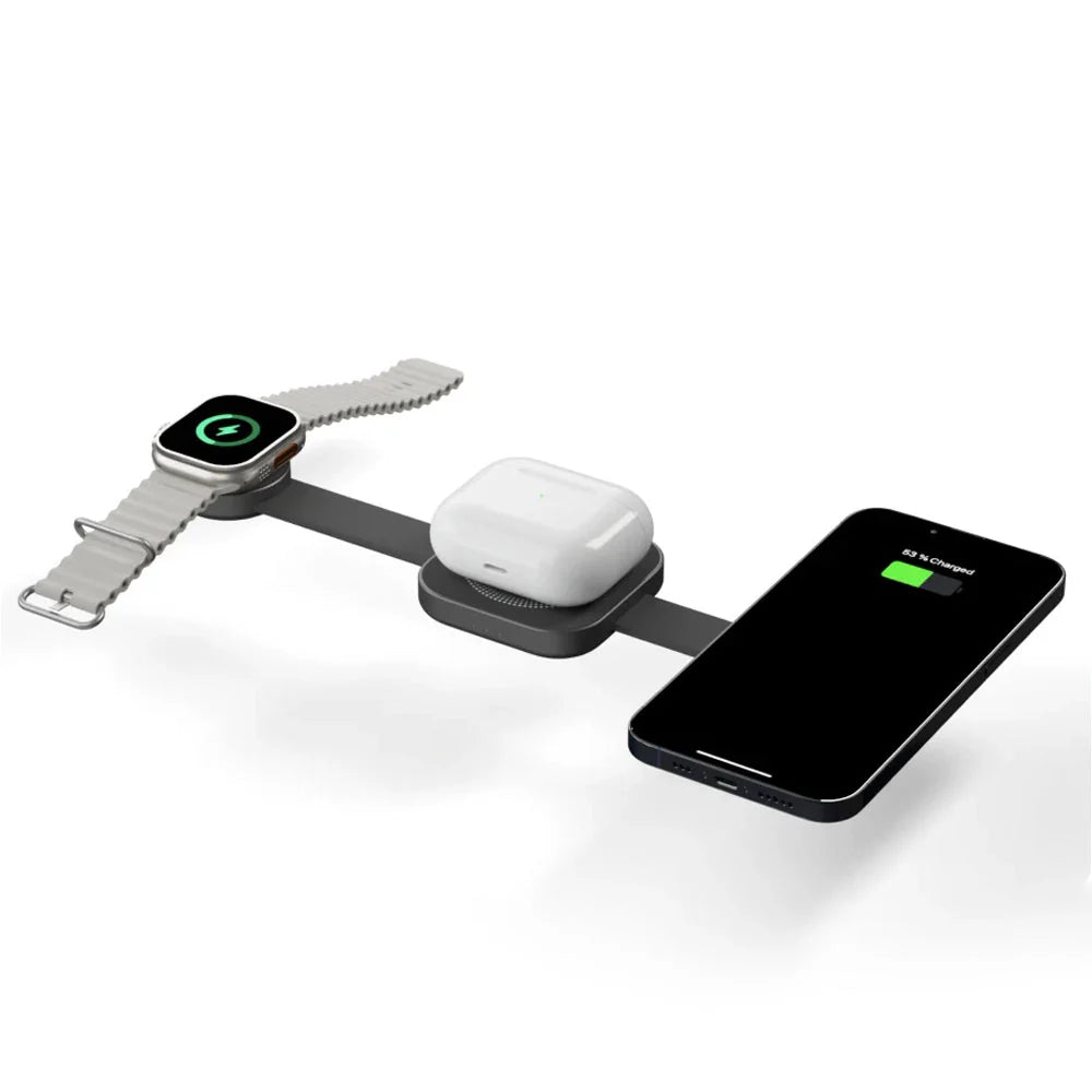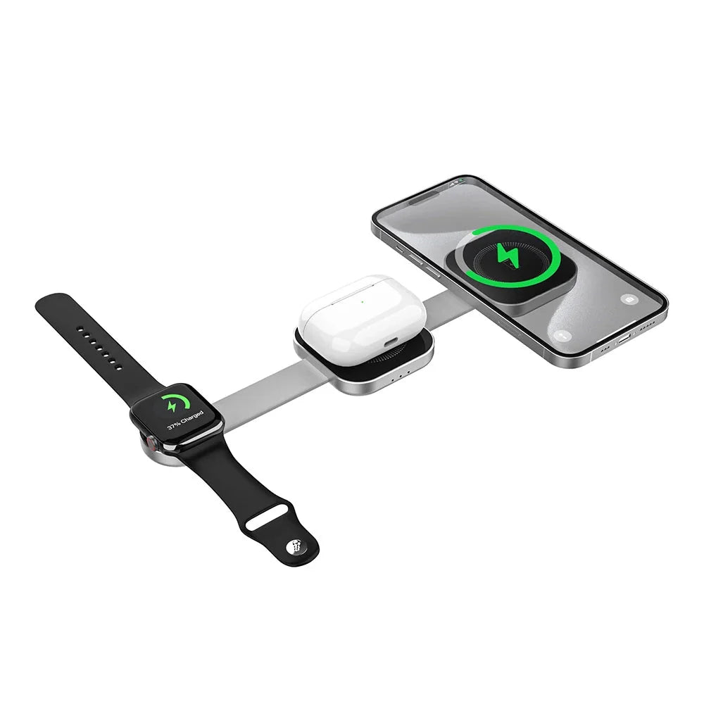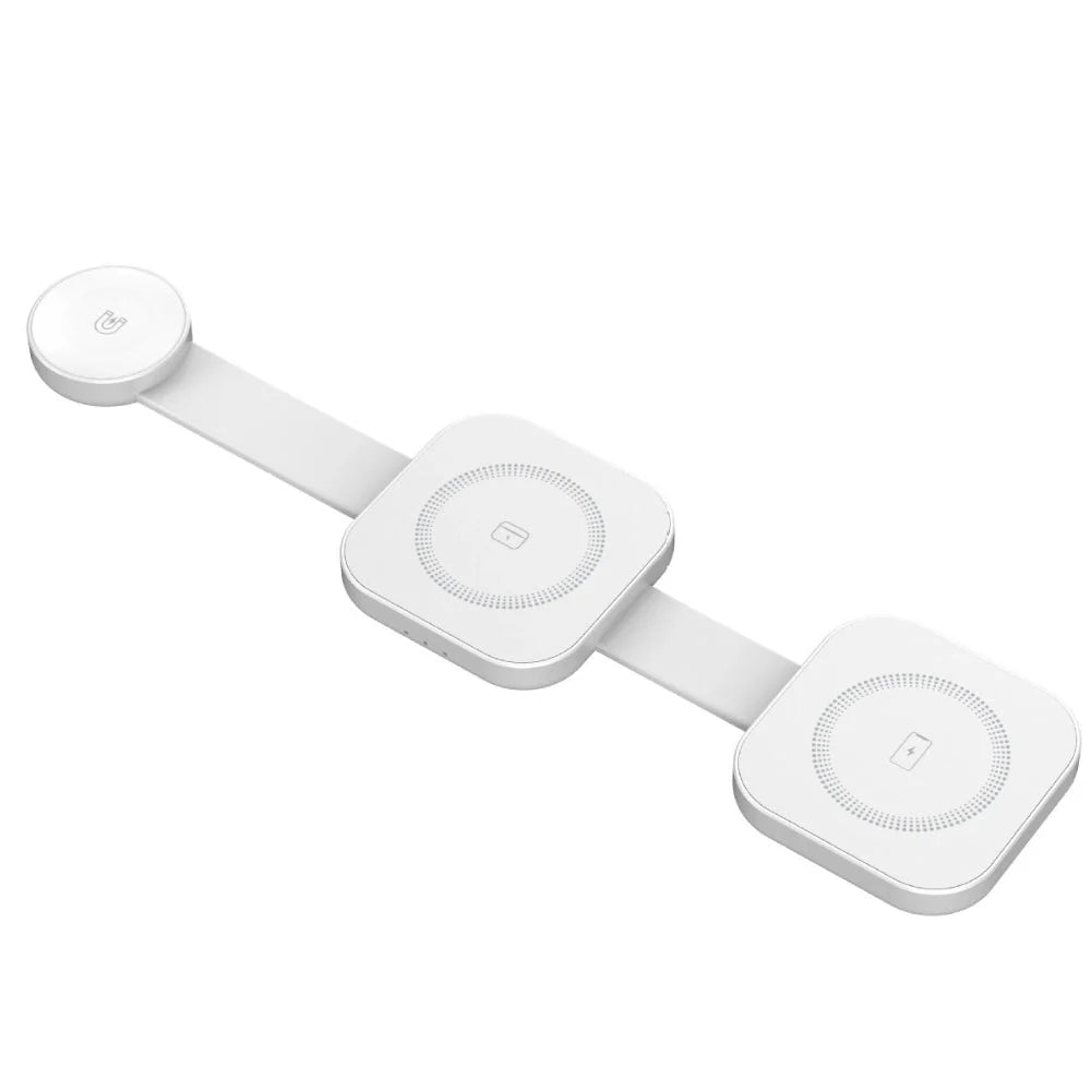 강력 하고 컴팩트하며 안전한 15W 무선 충전기, PowerMax Trio 접이식 3 in 1 무선 충전기를 소개합니다. 당신의 삶을 더욱 편리하게 만들어 줄 것입니다. 이 충전기는 과전류, 과전압, 과열 , 단락 및 자기장 으로부터 보호하는 스마트 칩 보안 기능 을 갖추고 있습니다. 15W 고속 충전 으로 기기를 빠르게 충전할 수 있습니다. 접이식 디자인 으로 휴대가 간편하고 여행에 적합하며, 자석 정렬 기능으로 정확하고 간편한 충전이 가능합니다. 최대 3대의 기기를 동시에 충전 할 수 있고, 이물질 감지 기능 으로 충전 문제를 방지하는 PowerMax Trio 접이식 3 in 1 무선 충전기는 어수선함과 작별하고 어디서든 효율적이고 안전한 충전을 즐길 수 있도록 도와줍니다.