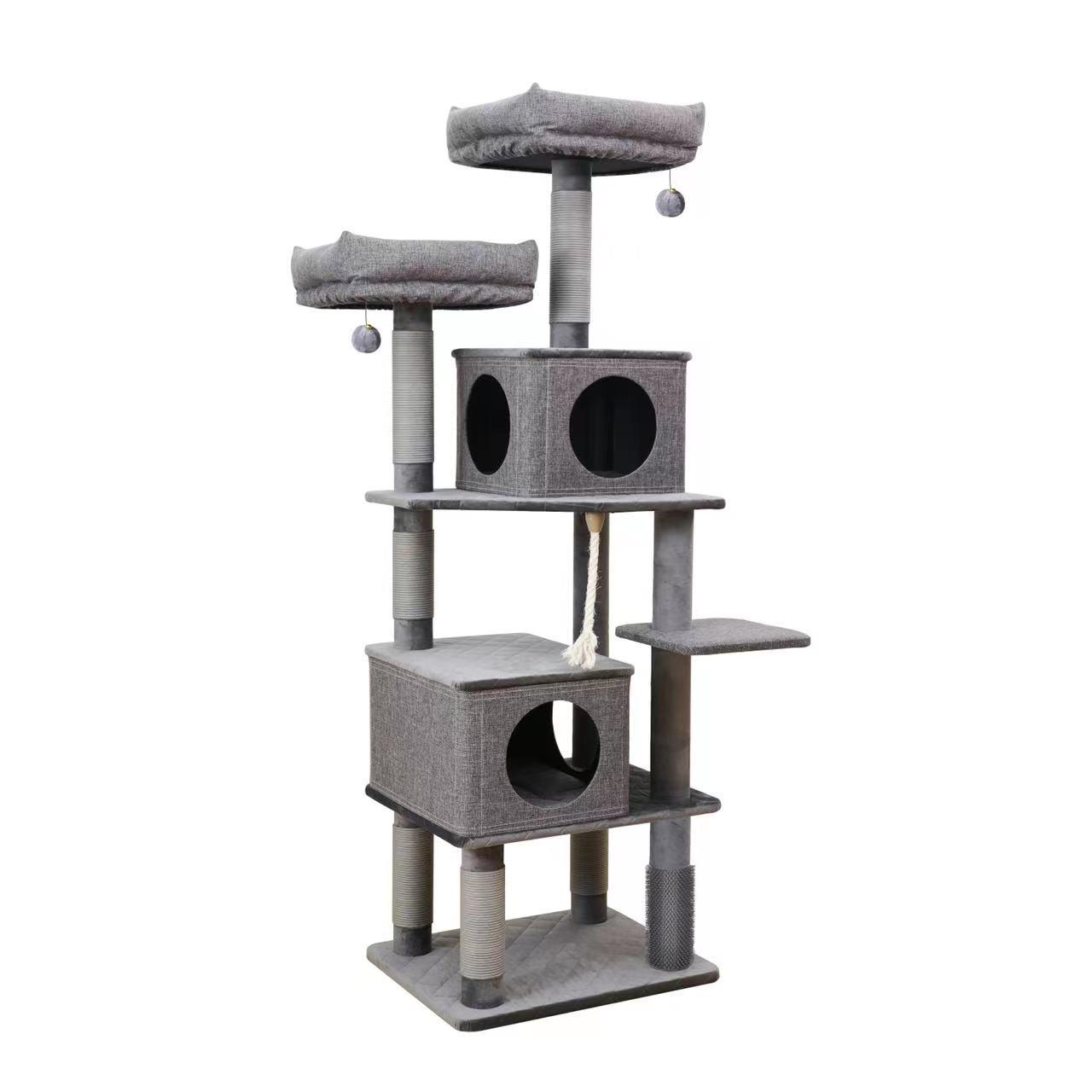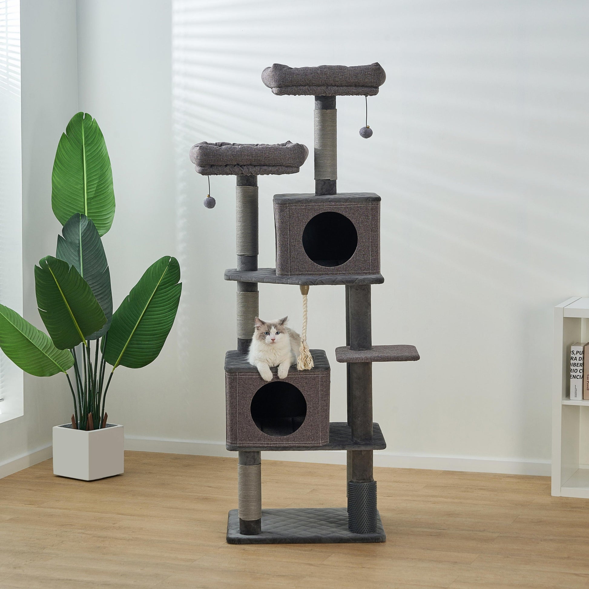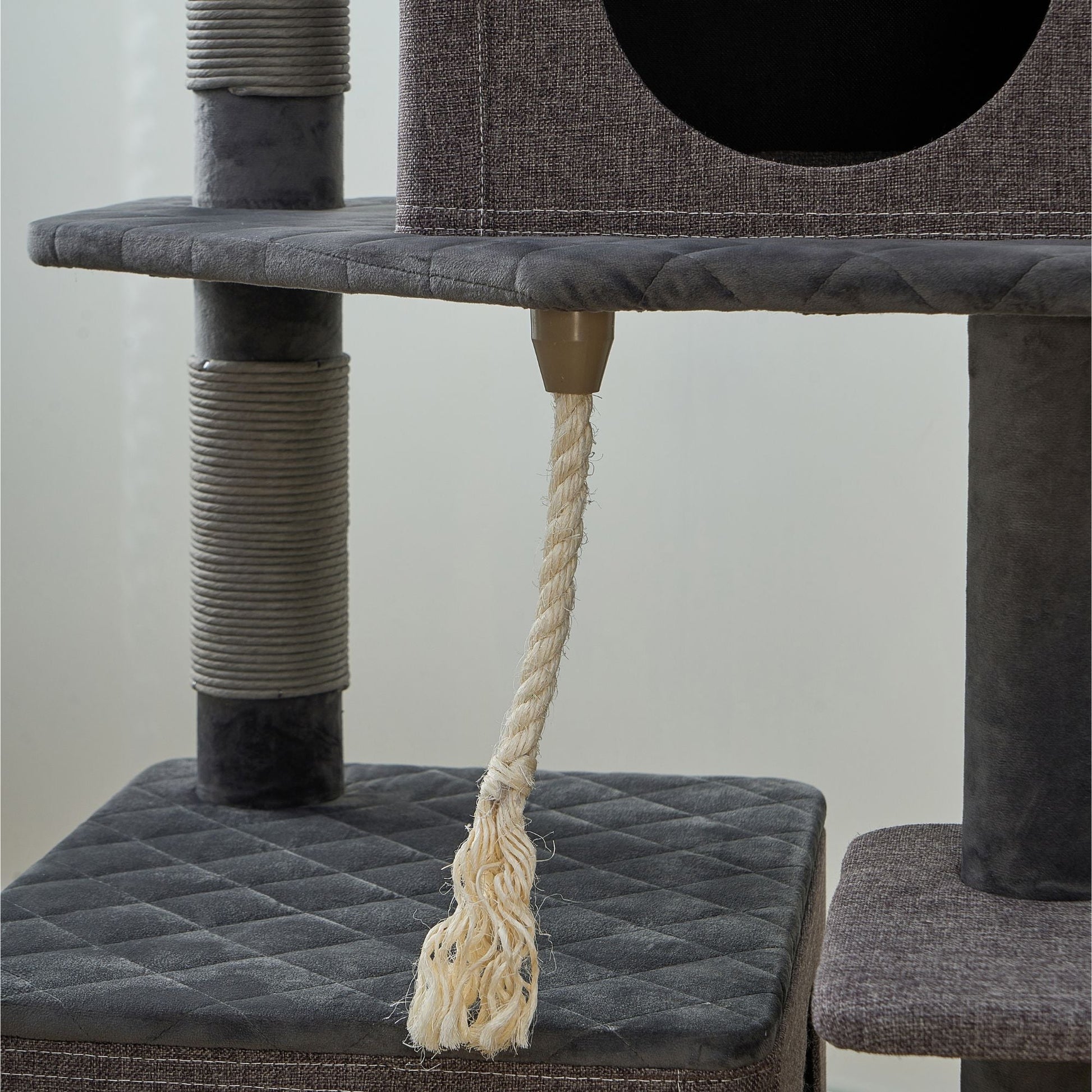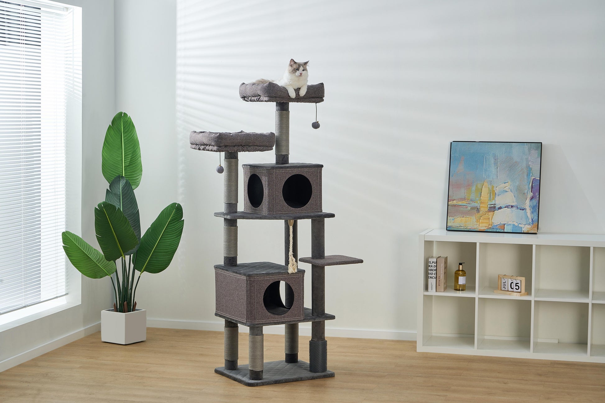 Catry Stella is a wonderful, tall cat tower equipped with the cat necessities of climbing, scratching, playing, grooming, and resting. This sophisticated contemporary design is made with premium linen and quilted velvet to blend perfectly with your home. Stella features 7 levels, furnished with recycled paper rope scratching posts to help naturally trim cat’s claws, a rubber groomer for a full body massage, teaser toys for entertainment, and two condos to provide privacy and relaxation. Your cat deserves only the best.