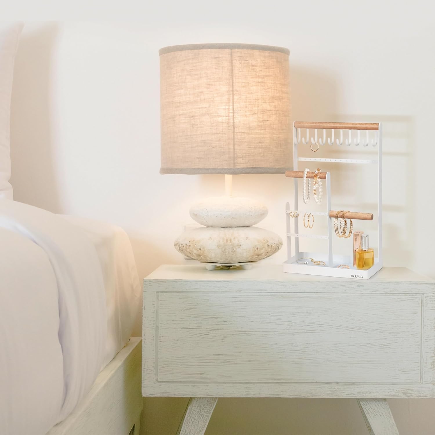 This GIA RIVERA premium jewellery holder stand is a stylish decor to any room. Plenty of room for necklaces, ear-rings, bracelets and watches. Store loose items like rings on the bottom tray of the necklace holder.