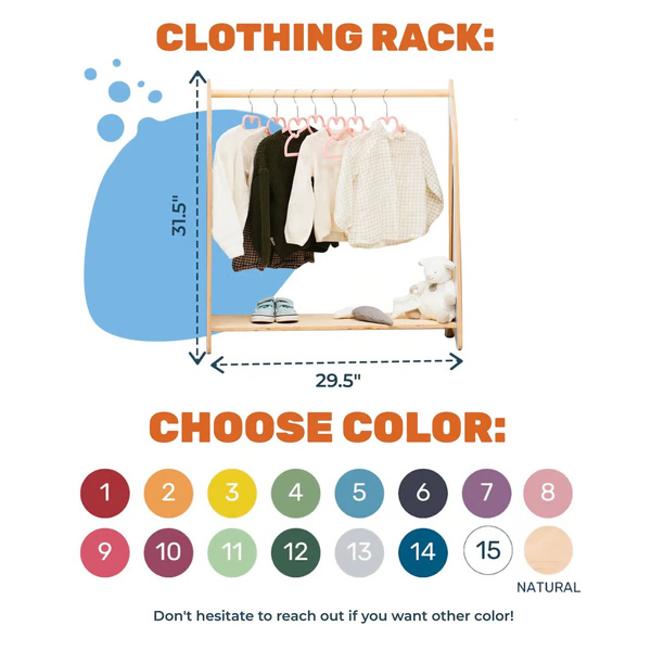 Featuring a solid wooden bar for clothes and a spacious lower shelf for shoes or baskets, this rack keeps outfits and accessories organized and within reach—perfect for teaching toddlers tidy habits.