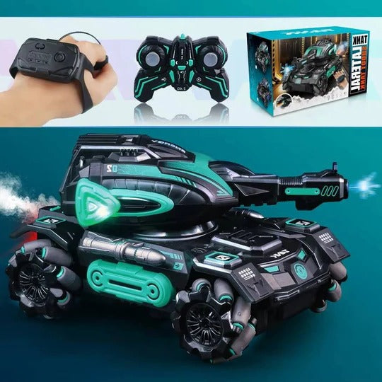 This four-wheel RC car includes an armored tank-style body, a built-in spray system, and a wireless 2.4G remote in the form of a wearable watch. The car performs a range of stunts while emitting LED lights and sound effects for interactive play.
